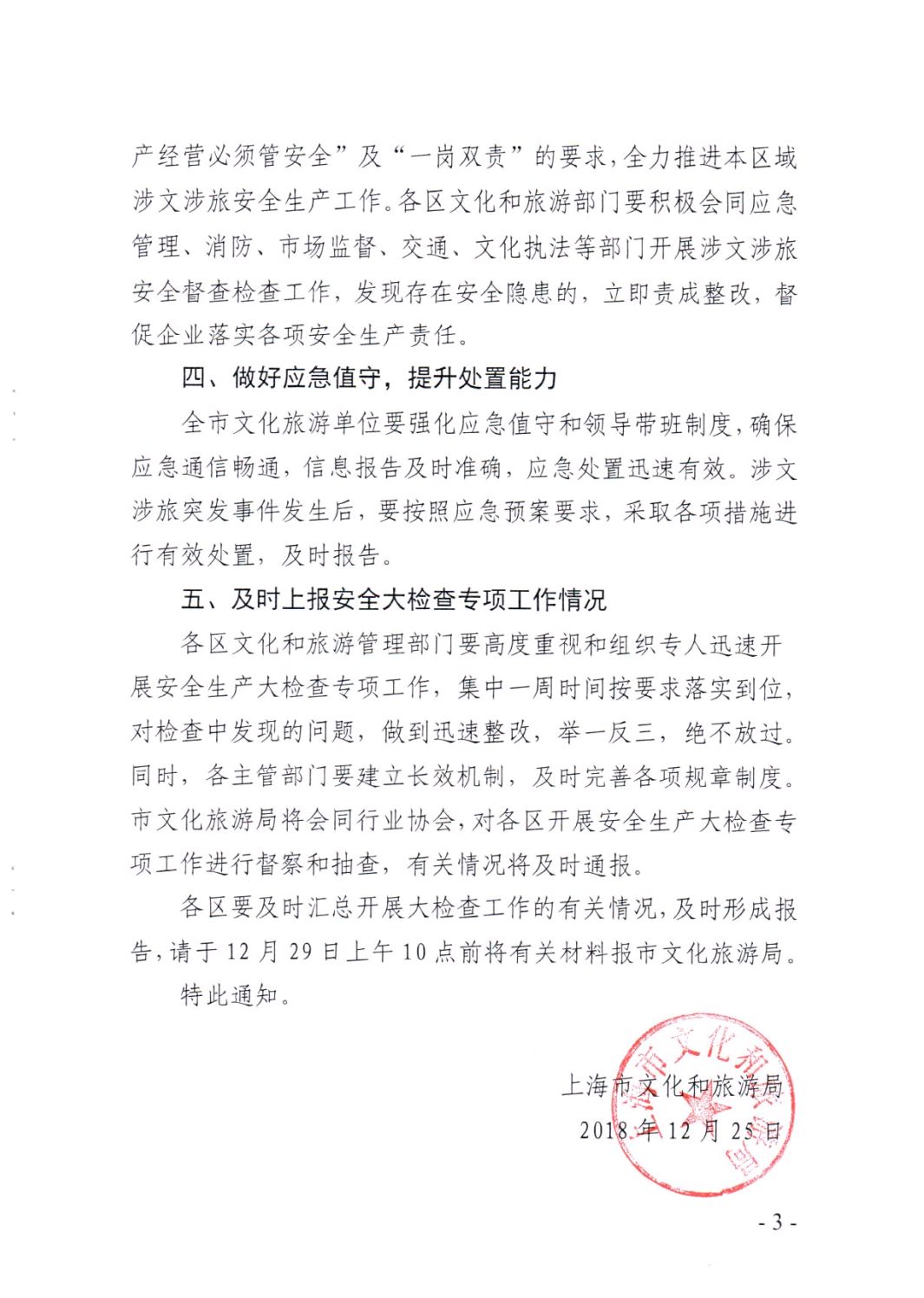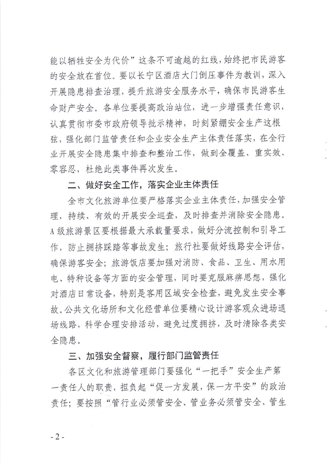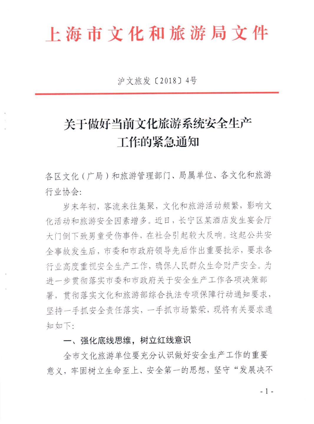 編者按: 針對(duì)近期行業(yè)出現(xiàn)的各類(lèi)安全事故,上海市文化和旅游局高度關(guān)注并發(fā)《關(guān)于做好當(dāng)前文化旅游系統(tǒng)安全生產(chǎn)工作的緊急通知》的文,要求酒店高度重視做好安全生產(chǎn)工作,確??腿松?cái)產(chǎn)安全。上海市飯店業(yè)分會(huì)公眾號(hào)轉(zhuǎn)發(fā)此通知,希望會(huì)員單位能引以為戒,自查自糾,杜絕各類(lèi)安全事故的發(fā)生。