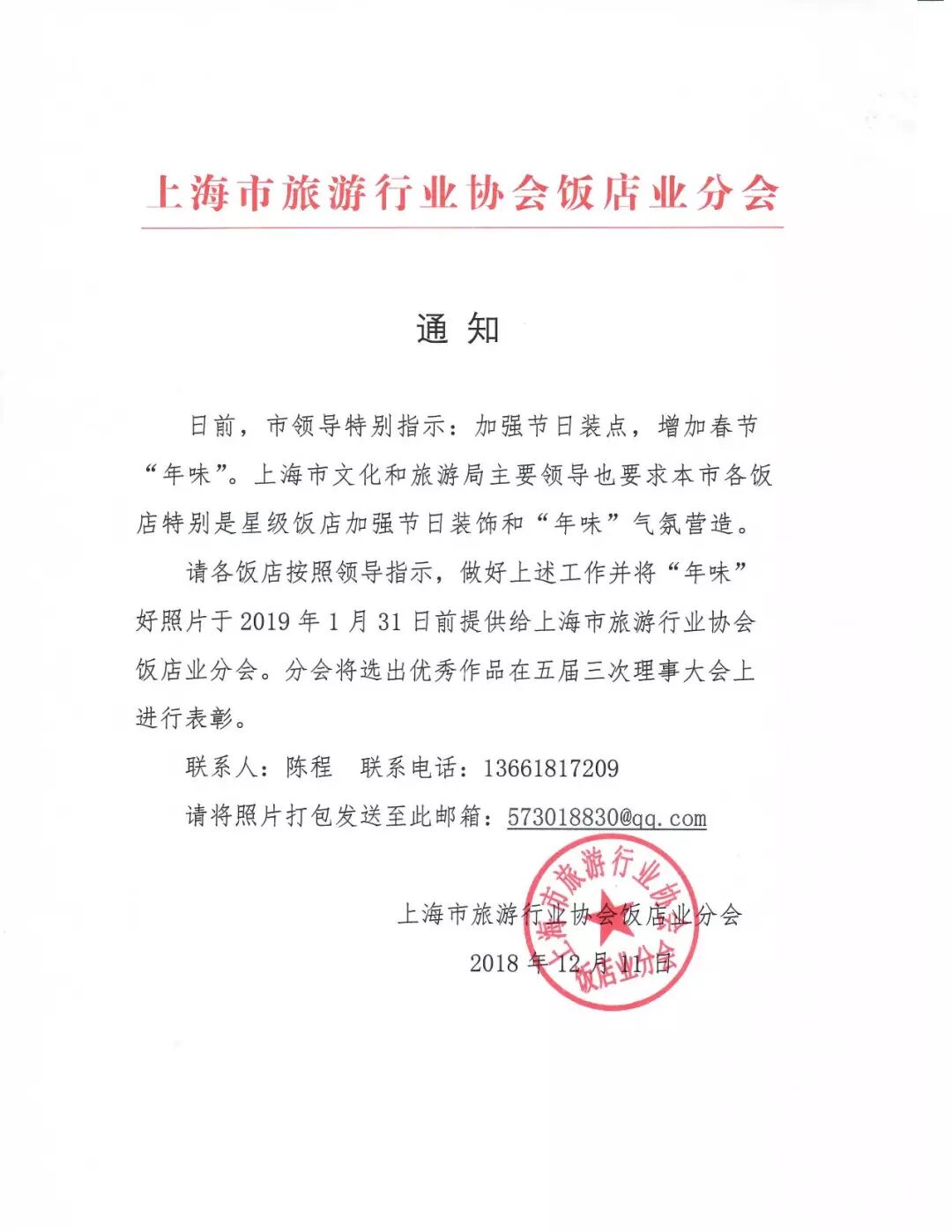 屬于我們的“年味” 為弘揚中華文化,充分挖掘文化資源,豐富文化內(nèi)涵,加強文化建設(shè),彰顯文化自信,上海市旅游行業(yè)協(xié)會飯店業(yè)分會繼2018年“年味”照片征集活動成功舉辦后,今年再接再厲,繼續(xù)開展“年味”活動,望各會員單位在活動中仍能積極參與,為上海增加過年的味道。 活動內(nèi)容: 將“年味”好照片于2019年1月31日前提供給上海市旅游行業(yè)協(xié)會飯店業(yè)分會,分會將選出優(yōu)秀作品在五屆三次理事大會上進行表彰。 聯(lián)系方式: 聯(lián)系人: 陳程 聯(lián)系電話:13661817209 請將照片打包發(fā)送至此郵箱:573018830@qq.com