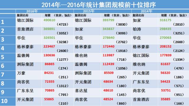 根據(jù)2016年度中國飯店集團60強的統(tǒng)計結(jié)果,我把位于前10位的飯店集團再做一個回顧。用綠色標出來的是前10位里面位于前3位的,其規(guī)模處于遙遙領(lǐng)先的地位。