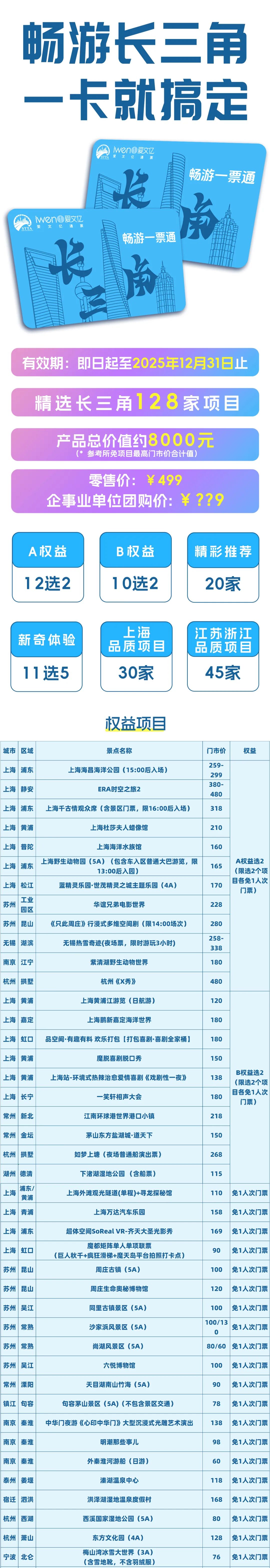 《2025暢游長三角一票通》精選長三角128家景點, A權(quán)益12任選2項,B權(quán)益10任選2項,外加100家景點各免一次,更新率達(dá)58%,包括#上海千古情、#上海海昌海洋公園、#杜莎夫人蠟像館、#華誼兄弟電影世界,無錫熱雪奇跡、上海野生動物園、杭州《X秀》等總價值超8000元!市場價499元,#企業(yè)福利價僅需299元! 使用日期即日起-2025年12月31日。