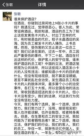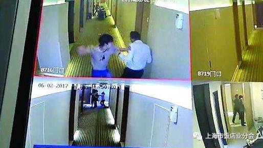 2017年6月2日17:40左右,酒店員工在監(jiān)控室發(fā)現(xiàn)2名“卡片黨”在7樓派發(fā)招嫖廣告,立即用對講機(jī)進(jìn)行了通知。店長要求他們立即交出剩余的非法廣告,并稱已報(bào)警。這時(shí),其中一人突然揮拳猛擊店長臉部及頭部??头堪⒁桃姶藫艽蛄?10,警察也很快趕到。最終成功扭獲一白衣男子并予以24小時(shí)拘留。,另一人通過消防樓梯逃脫。