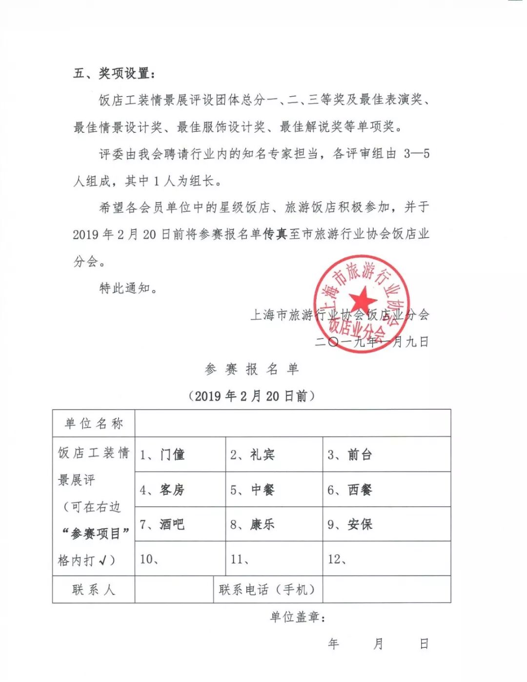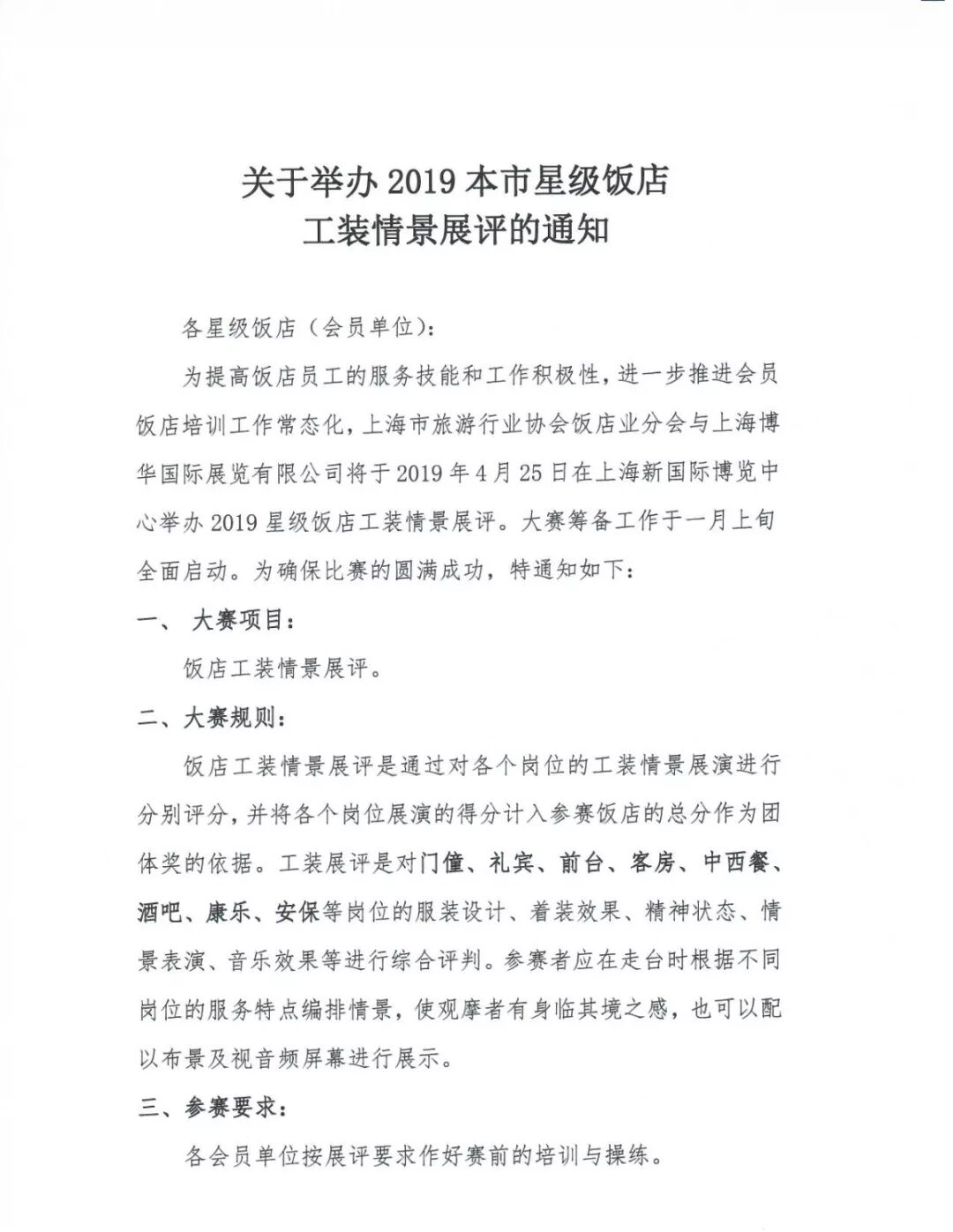 各星級飯店(會員單位): 為提高飯店員工的服務技能和工作積極性,進一步推進會員飯店培訓工作常態(tài)化,上海市旅游行業(yè)協(xié)會飯店業(yè)分會與上海博華國際會展有限公司將于 2019年4月25日在上海新國際博覽中心舉辦“2019星級飯店工裝情景展評”。希望各會員單位中的星級飯店、旅游飯店積極參加,并于2019年2月20日前將參賽報名單傳真至飯店業(yè)分會。