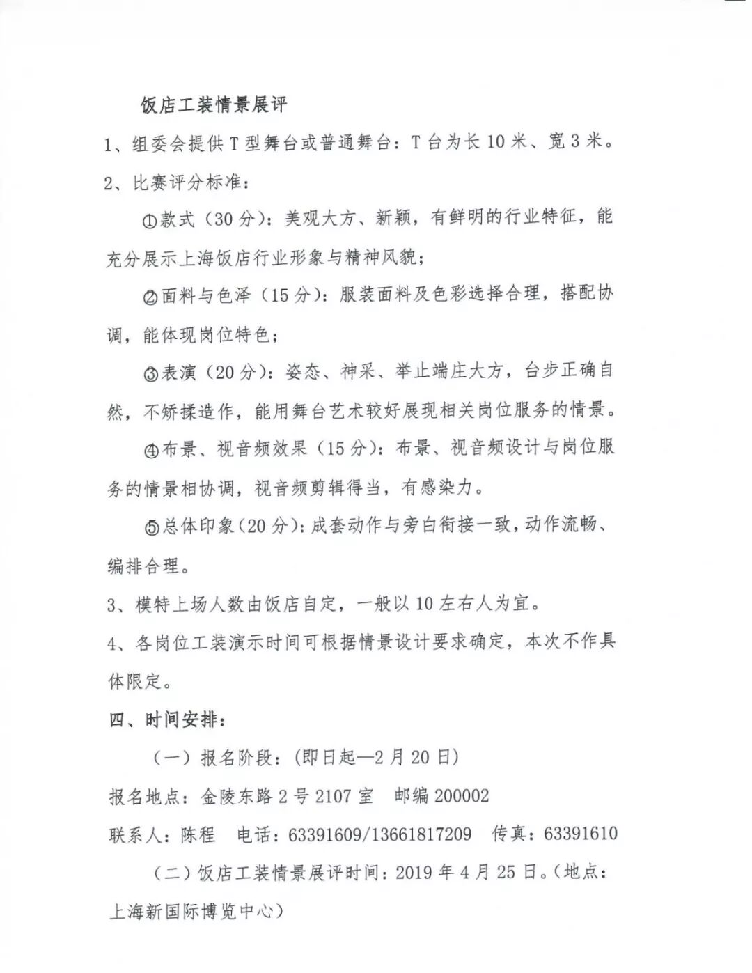 (3)表演(20分):姿態(tài)、神采、舉止端莊大方,臺步正確自然,不矯揉造作,能用舞臺藝術(shù)較好展現(xiàn)相關(guān)崗位服務的情景。